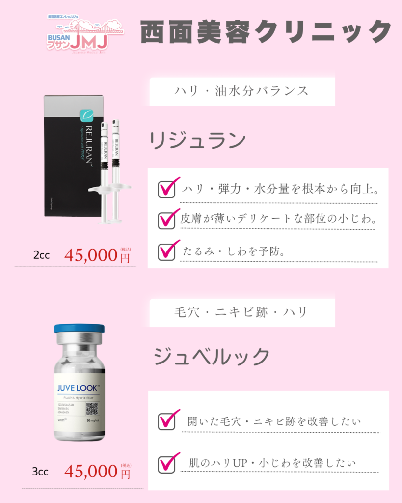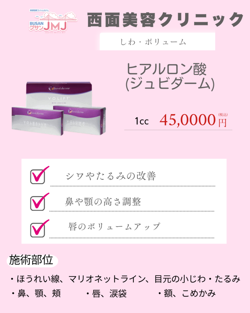 | ヒアルロン酸 (ジュビダーム) | 45万ウォン | 1ccあたり |