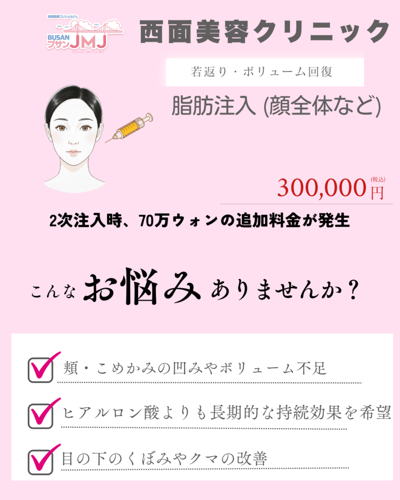 | 脂肪注入 (顔全体など) | 250万ウォン | 2次注入時、70万ウォンの追加料金が発生 |